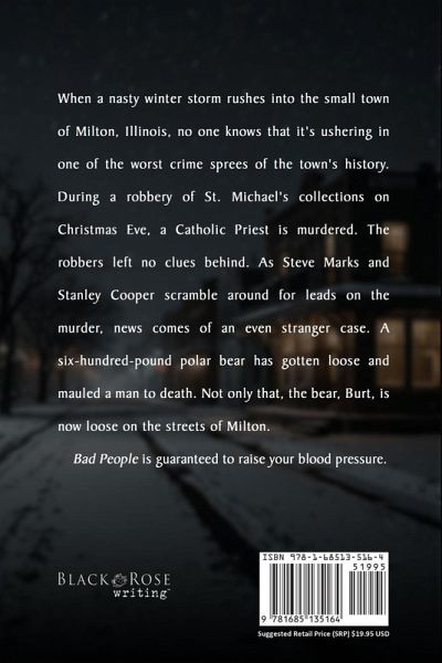 When a nasty winter storm rushes into the small town of Milton, Illinois, no one knows that it's ushering in one of the worst crime sprees of the town's history. During a robbery of St. Michael's collections on Christmas Eve, a Catholic Priest is murdered. The robbers left no clues behind. As Steve Marks and Stanley Cooper scramble around for leads on the murder, news comes of an even stranger case. A six-hundred-pound polar bear has gotten loose and mauled a man to death. Not only that, the bear, Burt, is now loose on the streets of Milton. Bad People is guaranteed to raise your blood pressure.