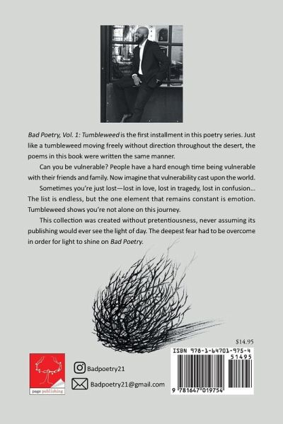 Can you be vulnerable? People have a hard enough time being vulnerable with their friends and family. Now imagine that vulnerability cast upon the world. This collection was created without pretentiousness, never assuming its publishing would ever see the light of day. The deepest fear had to be overcome in order for light to shine on Bad Poetry. Sometimes you're just lost--lost in love, lost in tragedy, lost in confusion... The list is endless, but the one element that remains constant is emotion. Tumbleweed shows you're not alone on this journey. Bad Poetry, Vol. 1: Tumbleweed is the first installment in this poetry series. Just like a tumbleweed moving freely without direction throughout the desert, the poems in this book were written the same manner.