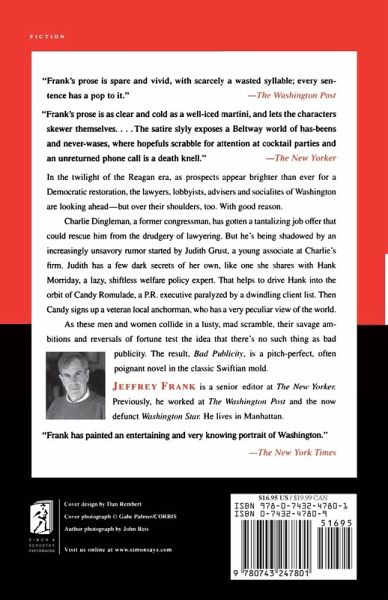 In the twilight of the Reagan era, as prospects appear brighter than ever for a Democratic restoration, the lawyers, lobbyists, advisers and socialites of Washington are looking ahead -- but over their shoulders, too. With good reason. Charlie Dingleman, a former congressman, has gotten a tantalizing job offer that could rescue him from the drudgery of lawyering. But he's being shadowed by an increasingly unsavory rumor started by Judith Grust, a young associate at Charlie's firm. Judith has a few dark secrets of her own, like one she shares with Hank Morriday, a lazy, shiftless welfare policy expert. That helps to drive Hank into the orbit of Candy Romulade, a P.R. executive paralyzed by a dwindling client list. Then Candy signs up a veteran local anchorman, who has a very peculiar view of the world. As these men and women collide in a lusty, mad scramble, their savage ambitions and reversals of fortune test the idea that there's no such thing as bad publicity. The result, Bad Publicity, is a pitch-perfect, often poignant novel in the classic Swiftian mold.