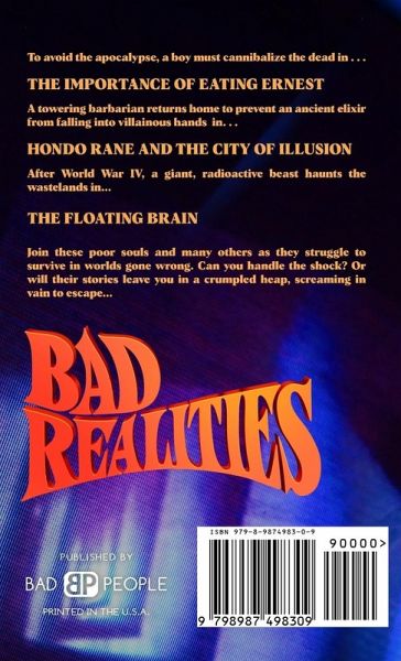 "Dark, indelible, and gleefully unsettling tales." - Kirkus Reviews Delve into the uncanny worlds of Bad Realities. Drawing from the realms of horror, fantasy, and science fiction, this anthology whisks readers away into unsettling realities that make you think long after the final page. "¿¿¿¿¿ I'm a horror junkie, I love the adrenaline rush. But this was on another level." A terrible fad involving large knives sweeps the country in . . . CHOP To avoid the apocalypse, a boy must cannibalize the dead in . . . THE IMPORTANCE OF EATING ERNEST A towering barbarian returns to his homeland to prevent an ancient elixir from falling into villainous hands in . . . HONDO RANE AND THE CITY OF ILLUSION After World War IV, a giant, radioactive beast haunts the wastelands. Can a psychic girl harness her secret powers long enough to stop . . . THE FLOATING BRAIN "¿¿¿¿¿ Truly stories of bad realities, some full of horror and others strange and gripping." With its blending of genres and consistent atmosphere of dread, Bad Realities promises to leave you rattled. Get your copy on paperback or Kindle today.