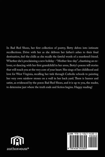 In Bad Red Shoes, her first collection of poetry, Betty delves into intimate recollections. Drive with her as she delivers her father's ashes to their final destination, feel the chills as she recalls the fateful words of a murdered friend. Whether she's proclaiming a new holiday - "Mother-less-day", chastising an ex-lover, or dancing with her first grandchild in her arms, Betty's poems tell stories that will touch you at the very core of your heart. She sings of her childhood and love for West Virginia, recalling her trek through Catholic schools to painting her very own rainbow stones on a wall in her back yard. There is humor and satire, as evidenced by the poem Bad Red Shoes, and it is up to you, the reader, to determine just where the truth ends and fiction begins. Happy reading!