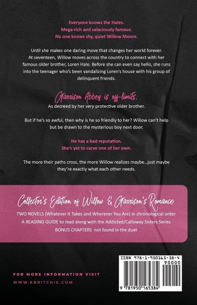 Everyone knows the Hales. Mega-rich and salaciously famous. No one knows shy, quiet Willow Moore. Until she makes one daring move that changes her world forever. At seventeen, Willow moves across the country to connect with her famous older brother, Loren Hale. Before she can even say hello, she runs into the teenager who's been vandalizing Loren's house with his group of delinquent friends. Garrison Abbey is off-limits. As decreed by her very protective older brother. But if he's so awful, then why is he so friendly to her? Willow can't help but be drawn to the mysterious boy next door. He has a bad reputation. She's yet to carve one of her own. The more their paths cross, the more Willow realizes maybe...just maybe they're exactly what each other needs. Bad Reputation is a collector's edition of Willow & Garrison's romance. It contains: TWO NOVELS (Whatever It Takes and Wherever You Are) in chronological order. A READING GUIDE to read along with the Addicted/Calloway Sisters Series. BONUS CHAPTERS not found in the duet. If you have not met Willow and Garrison yet, we highly recommend starting with Whatever It Takes.
