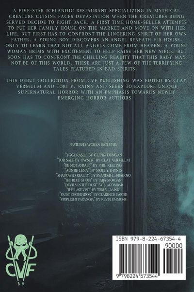 A five-star Icelandic restaurant specializing in mythical creature cuisine faces devastation when the creatures being served decide to fight back. A first time home-seller attempts to put her family house on the market and move on with her life, but first has to confront the lingering spirit of her own father. A young boy discovers an angel beneath his house, only to learn that not all angels come from heaven. A young woman brims with excitement to help raise her new niece, but soon has to confront the chilling reality that this baby may not be of this world. These are just a few of the terrifying tales featured in Bad Spirits. This debut collection from CVF Publishing was edited by Clay Vermulm and Tori V. Rainn and seeks to explore unique supernatural horror with an emphasis towards newly emerging horror authors. Featured works include: "Yggdrasil" by Glenn Dungan "For Sale by Owner" by Clay Vermulm "Be Not Afraid" by Phil Keeling "Auntie Lena" by Molly Thynes "Shadowed Reality" by Evander L. Fragoso "The Blue Ghost" by Taija Morgan "Devils in the Dust" by J. Agombar "The Last Visit" by Tori V. Rainn "Quiet Desperation" by Clarence Carter "Stoplight Paranoia" by Kevin Emmons