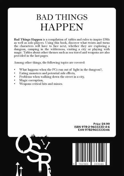 Bad Things Happen is a compilation of tables and rules to inspire DMs as well as solo players: using this book, discover what twists and turns the characters will have to face next. With this 54 pages supplement, generate all the bad things that happen to the characters, whether they are exploring a dungeon, camping in the wilderness, visiting a city or playing with magic. Tables about other themes such as sea travel and weapons are also provided in the last pages. This book is medieval-fantasy oriented and is meant to be used with your favorite OSR ruleset and bestiary. It is divided in five chapters that each contain various tables and rules: Dungeons ¿ What happens when the PCs run out of light in the dungeon?* ¿ Serious injuries, dark inclinations, phobia and strange encounters ¿ What happened to the hirelings while the PCs were in the dungeon? ¿ Alternatives to death depending on who/what defeated the PCs ¿ Why is the replacement PC in the dungeon? Wilderness ¿ What happens when the PCs cannot make it back to safety?* ¿ Illnesses, strange encounters, things that should not be eaten and food poisoning ¿ Traps (type, concealment, purpose) ¿ Starvation ¿ Eating monsters and potential side effects ¿ Wild animals encounters (day and night) ¿ Kingdom-sized encounters Cities ¿ What happens when the PCs are lost in the city at night?* ¿ Problems when walking down the street ¿ Buildings hazards ¿ Scams to avoid ¿ City events ¿ Strange laws and customs ¿ False rumors ¿ Why does the ruler hate the PCs so much? ¿ Crimes to be wrongly accused of ¿ Cellmates to meet Magic ¿ Magic corruption (caster and environment) ¿ Spell mishaps Other ¿ Sea voyage incidents ¿ Bad omens ¿ How to get rid of bad luck ¿ Haunted locations ¿ Weapons critical hits and misses ¿ Armors troubles * Tables of situations that can sometimes prevent a game over/TPK. This book is in black and white, is in A5 format and contains more than 10 hand drawn (vectorized) illustrations.