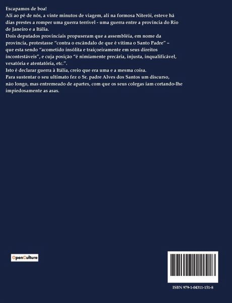 Escapamos de boa! Ali ao pé de nós, a vinte minutos de viagem, ali na formosa Niterói, esteve há dias prestes a romper uma guerra terrível - uma guerra entre a província do Rio de Janeiro e a Itália. Dois deputados provinciais propuseram que a assembléia, em nome da província, protestasse ¿contra o escândalo de que é vítima o Santo Padre¿ ¿ que esta sendo ¿acometido insólita e traiçoeiramente em seus direitos incontestáveis¿, e cuja posição ¿é nimiamente precária, injusta, inqualificável, vexatória e atentatória, etc.¿. Isto é declarar guerra à Itália, creio que era uma e a mesma coisa. Para sustentar o seu ultimato fez o Sr. padre Alves dos Santos um discurso, não longo, mas entremeado de apartes, com que os seus colegas iam cortando-lhe impiedosamente as asas.