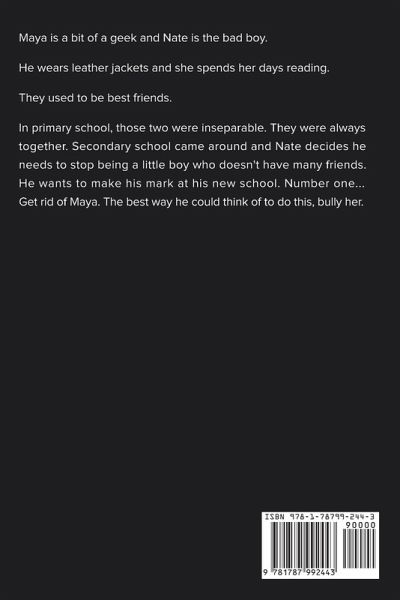 Maya is a bit of a geek and Nate is the bad boy. He wears leather jackets and she spends her days reading. They used to be best friends. In primary school, those two were inseparable. They were always together. Secondary school came around and Nate decides he needs to stop being a little boy who doesn't have many friends. He wants to make his mark at his new school. Number one... Get rid of Maya. The best way he could think of to do this, bully her.