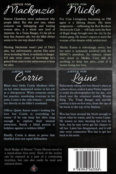 Books 1-4 in the Badge of Honor: Texas Heroes Series Justice for Mackenzie Daxton Chambers, a member of the oldest and most distinguished law enforcement agency in the state of Texas, never understood why people killed. But this new case, where someone was kidnapping and burying women alive, is a whole new level of depravity. As a Texas Ranger, it's his job to keep San Antonio safe, but the killer always seems to be one step ahead of him. Meeting Mackenzie, and finding out just how perfect she is for him, wasn't part of Dax's plan...but he'll be damned if he's going to walk away from the most interesting and fun woman he's met in a long time. Unfortunately, anyone Dax cares about is suddenly in danger. It'll take every ounce of knowledge he's gained from years in law enforcement to keep Mack alive. Justice for Mickie For Cruz Livingston, becoming an FBI agent is a lifelong dream, guarding the streets of San Antonio a calling. His latest assignment-infiltrating the Red Brothers Motorcycle Club-will help stem the flow of illegal drugs brought into the city by the violent gang. He expects the job to be dangerous. He doesn't expect to meet the woman of his dreams while undercover. Mickie Kaiser is refreshingly sweet, but her sister is intimately involved with the RBMC's president. Cruz can't afford to come clean about his double life without putting his operation in danger, but as violence creeps ever closer to Mickie, his priority becomes crystal clear. Cruz will do anything to keep Mickie alive...even if it means losing her love. Justice for Corrie Blind since birth, Corrie Madison relies on her other sharpened senses in her job as a chiropractor. Never did she imagine she'd have to depend on them to identify a killer. But when a man enters her practice, murdering everyone in his path, Corrie is the only witness-putting her directly in the killer's crosshairs. Officer Quint Axton wasn't looking for love, or even a relationship, until he meets Corrie. She's everything he wants-if he can keep her alive long enough to explore their mutual attraction. The threats on Corrie's life are escalating. Surely a blind person is helpless against a ruthless killer? Hardly. Corrie is about to prove that disabled does not equal defenseless. Justice For Laine Reluctantly taking her best friend's place at a photo shoot, realtor Laine Parker expects to assist the photographer for the day...not drool over the volunteer model, Westin King. The Texas Ranger and real-life cowboy is hot-on-hot sexy, from the tips of his boots to the top of his Stetson. Despite her visceral reaction to the man, the last thing Laine expects is a whirlwind romance-but that's exactly what she gets. Wes has been around the block enough to know what he wants, and he wants Laine. He wastes no time showing her how he feels...but he may never get the chance to tell her. Laine has disappeared, and it will take every connection Wes has-and a little help from a mangy stray-to get her back in his arms.