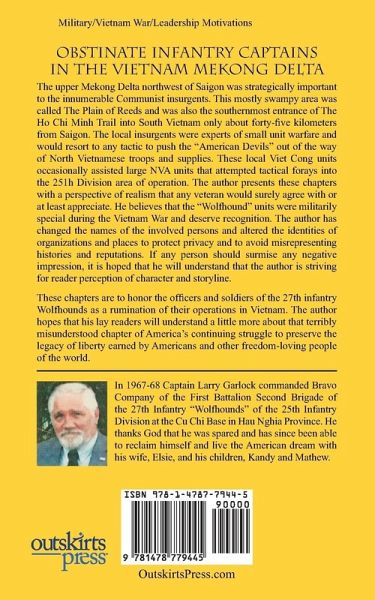 Obstinate infantry captains in the Vietnam Mekong Delta. . . The upper Mekong Delta northwest of Saigon was strategically important to the innumerable Communist insurgents. This mostly swampy area was called The Plain of Reeds and was also the southernmost entrance of The Ho Chi Minh Trail into South Vietnam only about forty-five kilometers from Saigon. The local insurgents were experts of small unit warfare and would resort to any tactic to push the "American Devils" out of the way of North Vietnamese troops and supplies. These local Viet Cong units occasionally assisted large NVA units that attempted tactical forays into the 251h Division area of operation. The author presents these chapters with a perspective of realism that any veteran would surely agree with or at least appreciate. He believes that the "Wolfhound" units were militarily special during the Vietnam War and deserve recognition. The author has changed the names of the involved persons and altered the identities of organizations and places to protect privacy and to avoid misrepresenting histories and reputations. If any person should surmise any negative impression, it is hoped that he will understand that the author is striving for reader perception of character and storyline. These chapters are to honor the officers and soldiers of the 27th infantry Wolfhounds as a rumination of their operations in Vietnam. The author hopes that his lay readers will understand a little more about that terribly misunderstood chapter of America's continuing struggle to preserve the legacy of liberty earned by Americans and other freedom-loving people of the world.