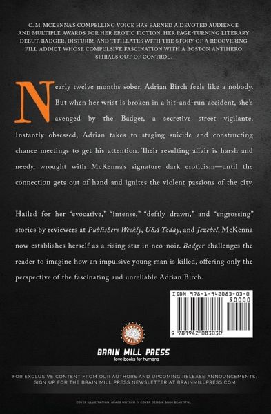 C. M. McKenna’s compelling voice has earned a devoted audience and multiple awards for her erotic fiction. Her page-turning literary debut, Badger, disturbs and titillates with the story of a recovering pill addict whose compulsive fascination with a Boston antihero spirals out of control. Nearly twelve months sober, Adrian Birch feels like a nobody. But when her wrist is broken in a hit-and-run accident, she’s avenged by the Badger, a secretive street vigilante. Instantly obsessed, Adrian takes to staging suicide and constructing chance meetings to get his attention. Their resulting affair is harsh and needy, wrought with McKenna’s signature dark eroticism—until the connection gets out of hand and ignites the violent passions of the city. Hailed for her "evocative," "intense," "realistic," and "engrossing" stories by reviewers at Publisher’s Weekly, USA Today, and Romantic Times, McKenna now establishes herself as a rising star in neo-noir. Badger challenges the reader to imagine how an impulsive young man is killed, offering only the perspective of the fascinating and unreliable Adrian Birch.