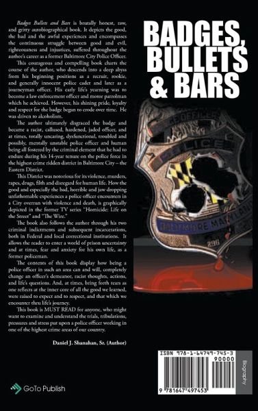 Badges, Bullets and Bars is brutally honest, raw, and gritty autobiographical book. It depicts the good, the bad and the awful experiences and encompasses the continuous struggle between good and evil, righteousness and injustices, suffered throughout the author's career as a former Baltimore City Police Officer. This courageous and compelling book charts the course of the author, who descends into a deep abyss from his beginning positions as a recruit, rookie, and generally innocent police cadet and later as a journeyman officer. His early life's yearning was to become a law enforcement officer and motor patrolman which he achieved. However, his shining pride, loyalty and respect for the badge began to erode over time. He was driven to alcoholism. The author ultimately disgraced the badge and became a racist, callused, hardened, jaded officer, and at times, totally uncaring, dysfunctional, troubled and possibly, mentally unstable police officer and human being all fostered by the criminal element that he had to endure during his 14-year tenure on the police force in the highest crime ridden district in Baltimore City - the Eastern District. This District was notorious for its violence, murders, rapes, drugs, filth and disregard for human life. How the good and especially the bad, horrible and jaw dropping unfathomable experiences a police officer encounters in a City overrun with violence and death, is graphically depicted in the former TV series "Homicide: Life on the Street" and "The Wire." The book also follows the author through his two criminal indictments and subsequent incarcerations, both in Federal and local correctional institutions. It allows the reader to enter a world of prison uncertainty and at times, fear and anxiety for his own life, as a former policeman. The contents of this book display how being a police officer in such an area can and will, completely change an officer's demeanor, racist thoughts, actions, and life's questions. And, at times, bring forth tears as one reflects at the inner core of all the good we learned, were raised to expect and to respect, and that which we encounter thru life's journey. This book is MUST READ for anyone, who might want to examine and understand the trials, tribulations, pressures and stress put upon a police officer working in one of the highest crime areas of our country.