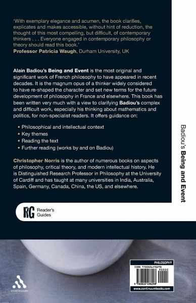 Alain Badiou's Being and Event is the most original and significant work of French philosophy to have appeared in recent decades. It is the magnum opus of a thinker who is widely considered to have re-shaped the character and set new terms for the future development of philosophy in France and elsewhere. This book has been written very much with a view to clarifying Badiou's complex and demanding work for non-specialist readers. It offers guidance on philosophical and intellectual context, key themes, reading the text, reception and influence; and further reading.