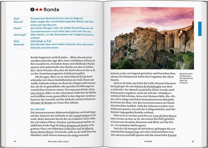 Gliederung derSehenswürdigkeiten in die drei Rubriken »TOP 10«, »Nicht verpassen!« und »Nach Lust und Laune!« Inspirierende Tourenvorschläge für Spaziergänge durch die schönsten Orte Andalusiens Tipps für genussvolle »kleine Pausen« in Cafés, Restaurants oder Bars und »magische Momente« in der Region Südspaniens Spannende Hintergrundinfos zu Andalusiens Geschichte und seinen Sehenswürdigkeiten, zu Landschaft und Klima, Wirtschaft und Kultur sowie den Menschen und deren Alltag Servicekapitel mit »praktischen Informationen« zum Alltag und für die Vorbereitung der Reise Schnelle Orientierung mit Atlas im Buch und herausnehmbarer Faltkarte