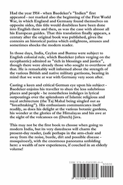 This is the first official English translation of Baedeker's "India", by Michael Wild, Baedeker historian. This title which originally appeared in only one (German-language) edition in 1914,casts a very interesting and fascinating light on colonial India, Ceylon, Burma etc. under British rule.