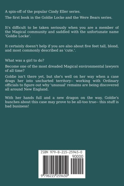 A spin-off of the popular Cindy Eller series. The first book in the Goldie Locke and the Were Bears series. It's difficult to be taken seriously when you are a member of the Magical community and saddled with the unfortunate name 'Goldie Locke'. It certainly doesn't help if you are also about five feet tall, blond, and most commonly described as 'cute.'. What was a girl to do? Become one of the most dreaded Magical environmental lawyers of all time? Goldie isn't there yet, but she's well on her way when a case drags her into uncharted territory-- working with Ordinary officials to figure out why 'unusual' remains are being discovered all around New England. With her hands full and a new dragon on the way, Goldie's hunches about this case may prove to be all-too true-- this stuff is bad business!