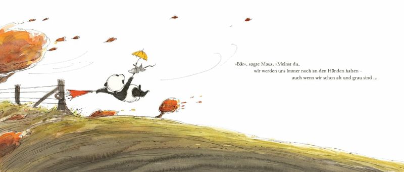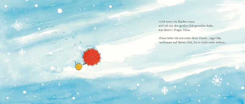Maus und Bär werden im Umschlagtext als Freunde beschrieben, doch im Buch wird nichts darüber erwähnt und sie könnten genauso gut Eltern/Großeltern und Kind oder ein Liebespaar sein.