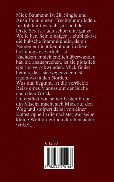 Mick Baumann ist 28, Single und Aushilfe in einem Fruchtgummiladen. Im Job läuft es nicht gut und der letzte Sex ist auch schon eine ganze Weile her. Sein einziger Lichtblick ist die hübsche Stammkundin, deren Namen er nicht kennt und in die er hoffnungslos verliebt ist. Nachdem er sich endlich überwunden hat, sie anzusprechen, ist sie plötzlich spurlos verschwunden. Mick findet heraus, dass sie weggezogen ist - irgendwo in den Norden. Was nun beginnt, ist die verrückte Reise eines Mannes auf der Suche nach dem Glück. Unterstützt von seiner besten Freundin Mischa macht sich Mick auf den Weg und stolpert dabei von einer Katastrophe in die nächste, was seine kleine Welt ordentlich durcheinander wirbelt...