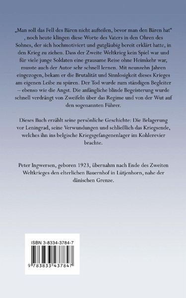 "Man soll das Fell des Bären nicht aufteilen, bevor man den Bären hat", noch heute klingen diese Worte des Vaters in den Ohren des Sohnes, der sich hochmotiviert und gutgläubig bereit erklärt hatte, in den Krieg zu ziehen. Dass der Zweite Weltkrieg kein Spiel war und für viele junge Soldaten eine grausame Reise ohne Heimkehr war, musste auch der Autor sehr schnell lernen. Mit neunzehn Jahren eingezogen, bekam er die Brutalität und Sinnlosigkeit dieses Krieges am eigenen Leibe zu spüren. Der Tod wurde zum ständigen Begleiter ¿ ebenso wie die Angst. Die anfängliche blinde Begeisterung wurde schnell verdrängt von Zweifeln über das Regime und von der Wut auf den sogenannten Führer. Dieses Buch erzählt seine persönliche Geschichte: Die Belagerung vor Leningrad, seine Verwundungen und schließlich das Kriegsende, welches ihn ins belgische Kriegsgefangenenlager im Kohlerevier brachte. Peter Ingwersen, geboren 1923, übernahm nach Ende des Zweiten Weltkrieges den elterlichen Bauernhof in Lütjenhorn, nahe der dänischen Grenze.