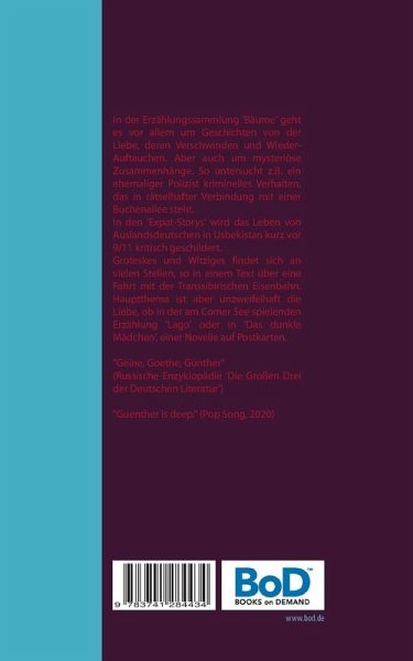 In der Erzählungssammlung 'Bäume' geht es vor allem um Geschichten von der Liebe, deren Verschwinden und Wiederfinden. Aber auch um mysteriöse Zusammenhänge. So untersucht z.B. ein schuldbeladener, ehemaliger Polizeibeamter kriminelles Verhalten, das in rätselhafter Verbindung mit einer Buchenallee steht.In den 'Expat-Storys' wird das Leben von Auslandsdeutschen in Usbekistan kurz vor 9/11 kritisch geschildert, 'Azzurro' dagegen bietet Momentaufnahmen einer Reise durch Italien.Groteskes und Witziges findet sich an vielen Stellen, so in einem Text über eine Fahrt mit der Transsibirischen Eisenbahn. Hauptthema ist aber unzweifelhaft die Liebe, ob im am Comer See spielenden 'Lago' oder in 'Das dunkle Mädchen', einer Novelle auf Postkarten.
