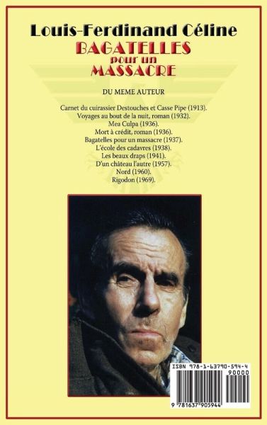 Bagatelles pour un massacre, publié en décembre 1937 par les Éditions Denoël, fut rédigé durant le deuxième semestre de l'année 1937, il est le deuxième pamphlet de Céline, après Mea Culpa publié au début de la même année. Il est dédié à Eugène Dabit et A mes potes du Théâtre en Toile. A sa publication, Bagatelles pour un massacre est vendu à 75 000 exemplaires, mais le 10 mai 1939, Céline et son éditeur Robert Denoël décident de le retirer de la vente, tout comme L'Ecole des cadavres, bien que le décret-loi Marchandeau ne les vise pas directement. Sous Vichy, Denoël le réédite à deux reprises, en 1942 puis en octobre 1943, dans une édition augmentée de vingt photographies hors-texte, dont certaines semblent avoir été fournies par la Propaganda Staffel. L'ouvrage est un best-seller pour l'éditeur, et Bagatelles pour un massacre est, avec Les Décombres de Lucien Rebatet, l'un des titres qui se vendent le mieux sous l'Occupation.