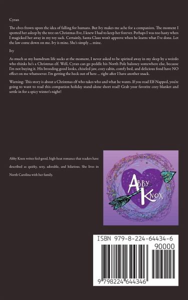 Cyran The elves frown upon the idea of falling for humans. But Ivy makes me ache for a companion. The moment I spotted her asleep by the tree on Christmas Eve, I knew I had to keep her forever. Perhaps I was too hasty when I magicked her away in my toy sack. Certainly, Santa Claus won't approve when he learns what I've done. Let the law come down on me. Ivy is mine. She's simply ... mine. Ivy As much as my humdrum life sucks at the moment, I never asked to be spirited away in my sleep by a weirdo who thinks he's a Christmas elf. Well, Cyran can go peddle his North Pole baloney somewhere else, because I'm not buying it. His brooding good looks, chiseled jaw, cozy cabin, comfy bed, and delicious food have NO effect on me whatsoever. I'm getting the heck out of here ... right after I have another snack. Warning: This story is about a Christmas elf who takes who and what he wants. If you read Elf-Napped, you're going to want to read this companion holiday stand-alone short read! Grab your favorite cozy blanket and settle in for a spicy winter's night!