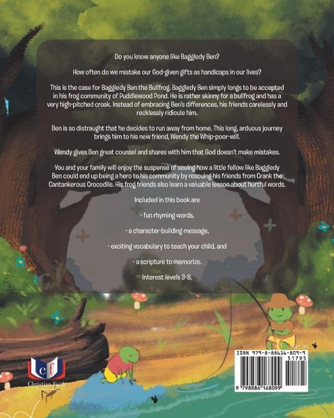 Do you know anyone like Baggledy Ben? How often do we mistake our God-given gifts as handicaps in our lives? This is the case for Baggledy Ben the Bullfrog. Baggledy Ben simply longs to be accepted in his frog community of Puddlewood Pond. He is rather skinny for a bullfrog and has a very high-pitched croak. Instead of embracing Ben's differences, his friends carelessly and recklessly ridicule him. Ben is so distraught that he decides to run away from home. This long, arduous journey brings him to his new friend, Wendy the Whip-poor-will. Wendy gives Ben great counsel and shares with him that God doesn't make mistakes. You and your family will enjoy the suspense of seeing how a little fellow like Baggledy Ben could end up being a hero to his community by rescuing his friends from Crank the Cantankerous Crocodile. His frog friends also learn a valuable lesson about hurtful words. Included in this book are - fun rhyming words, - a character-building message, - exciting vocabulary to teach your child, and - a scripture to memorize. Interest levels 3-8.