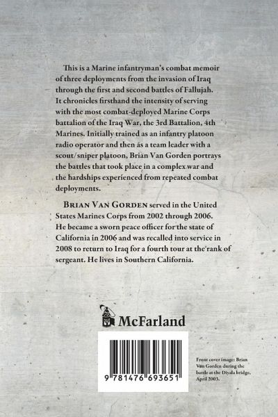 This is a Marine infantryman's combat memoir from the Invasion of Iraq to the Battle of Fallujah. It chronicles firsthand accounts of war while serving with the most combat-deployed Marine Corps battalion of the Iraq War, the 3rd Battalion, 4th Marines. Initially trained as an infantry platoon radio operator and then as a team leader with a scout/sniper platoon, Brian Van Gorden portrays the battles that took place in a complex war and the hardships experienced from repeated combat deployments.