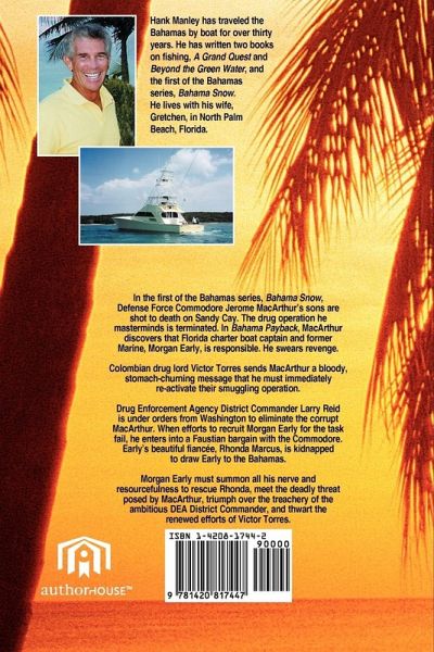 In the first of the Bahamas series, Bahama Snow, Defense Force Commodore Jerome MacArthur's sons are shot to death on Sandy Cay. The drug operation he masterminds is terminated. In Bahama Payback, MacArthur discovers that Florida charter boat captain and former Marine, Morgan Early, is responsible. He swears revenge. Columbian drug lord Victor Torres sends MacArthur a bloody, stomach-churning message that he must immediately re-activate their smuggling operation. Drug Enforcement Agency District Commander Larry Reid is under orders from Washington to eliminate the corrupt MacArthur. When efforts to recruit Morgan Early for the task fail, he enters into a Faustian bargain with the Commodore. Early's beautiful fiancée, Rhonda Marcus, is kidnapped to draw Early to the Bahamas. Morgan Early must summon all his nerve and resourcefulness to rescue Rhonda, meet the deadly threat posed by MacArthur, triumph over the treachery of the ambitious DEA District Commander, and thwart the renewed efforts of Victor Torres.
