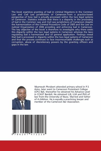 The book examines granting of bail in criminal litigations in the Common Law and Civil Law jurisdictions of Cameroon from a practice-based perspective of how bail is actually processed within the two legal systems of Cameroon. Statistics indicate that there is a disparity in the processing of bail in the Common Law and Civil Law jurisdictions of Cameroon despite the harmonization of the Criminal Procedure Code of 2005 and the Law on Judicial Organization of 2006 providing and enforcing bail in Cameroon. The key objective of the book is therefore to investigate why there exists this disparity within the two legal systems in Cameroon whereas the laws regulating bail is harmonized and of general application. Findings reveal that bail is processed in disparity within the two legal systems of Cameroon and that the process continues to face insurmountable challenges such as corruption, abuse of discretionary powers by the granting officers and gaps in the law.