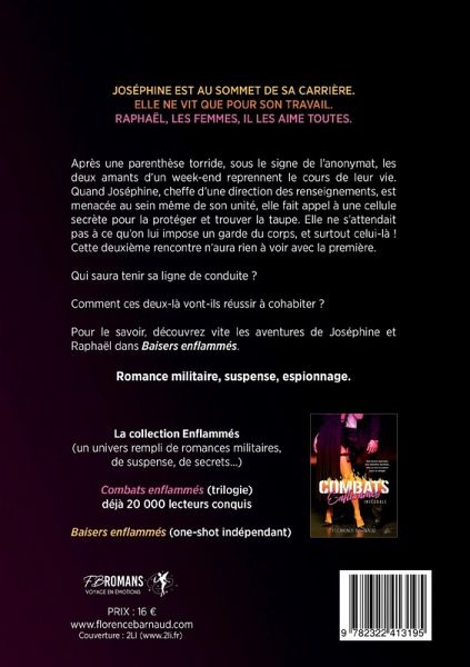 Joséphine est une femme déterminée et obsédée par sa carrière.Raphaël est un séducteur invétéré dont le charme est irrésistible.Leur aventure torride et éphémère, placée sous le sceau de l'anonymat, les laisse haletants, convaincus de ne jamais se recroiser.Tout bascule lorsque Joséphine, à la tête d'un département de renseignements, se retrouve en danger au coeur même de son organisation. Contrainte de solliciter l'aide d'une unité secrète, elle est bouleversée de découvrir que son nouveau garde du corps n'est autre que Raphaël, l'amant furtif qui hante ses pensées.Leur deuxième rencontre, loin d'être une coïncidence, les plonge dans un tourbillon d'émotions et de désirs interdits.Résisteront-ils à la tentation ?Parviendront-ils à démasquer la taupe tout en préservant leur secret brûlant ?Plongez dans le monde de l'espionnage, des jeux de pouvoir et des passions dévorantes avec "Baisers Enflammés", une une histoire d'amour passionnée et intense.Romance militaire, suspense, espionnage.La collection Enflammés (un univers rempli de romances militaires, de suspense, de secrets) :-Combats enflammés (trilogie)-Baisers enflammés-Protection enflamméeChaque "Enflammés" peut être lu indépendamment des autres et ne se termine pas sur un suspense.