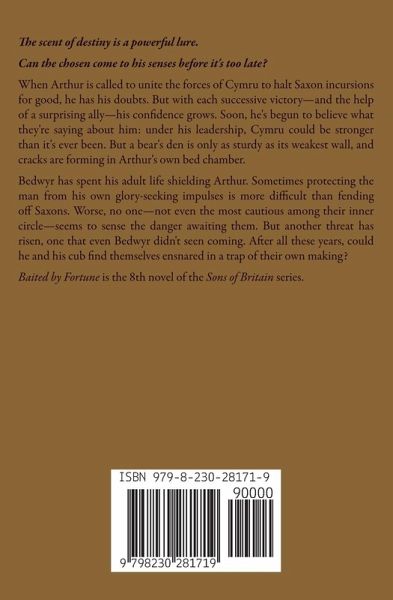 The scent of destiny is a powerful lure. Can the chosen come to his senses before it's too late? When Arthur is called to unite the forces of Cymru to halt Saxon incursions for good, he has his doubts. But with each successive victory-and the help of a surprising ally-his confidence grows. Soon, he's begun to believe what they're saying about him: under his leadership, Cymru could be stronger than it's ever been. But a bear's den is only as sturdy as its weakest wall, and cracks are forming in Arthur's own bed chamber. ~ Bedwyr has spent his adult life shielding Arthur. Sometimes protecting the man from his own glory-seeking impulses is more difficult than fending off Saxons. Worse, no one-not even the most cautious among their inner circle-seems to sense the danger awaiting them. But another threat has risen, one that even Bedwyr didn't seen coming. After all these years, could he and his cub find themselves ensnared in a trap of their own making? BAITED BY FORTUNE is the 8th novel of the SONS OF BRITAIN series. It ends on several CLIFFHANGERS that will resolve in Book 9. For content notes, please visit the author's website.