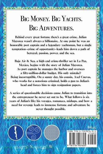 Big Money. Big Yachts. Big Adventures. Behind every great fortune there is a great crime. Julian Mayorca wasn't always a billionaire. At one point he was an honorable port captain and legendary yachtsman, but a single temptation-a crime of opportunity-leads him down a path of betrayal, passion, power, and the sea. Baja Air & Sea, a high end crime-thriller set in La Paz, Mexico, begins with the story of Julian Mayorca. As a port captain, he manages the harbor and oversees a fifty-million-dollar budget. His only mistake? Being incorruptible. Ona sunny day, his cousin, Alex Cuevas, who works for a notorious criminal, holds a gun to Julian's head and forces him to sign resignation papers. A series of questionable decisions cause Julian to transition into the entrepreneur he never set out to be. What follows is six years of Julian's life; his voyages, romances, mishaps, and how a need for revenge leads to immense fortune and adventure he never thought possible.
