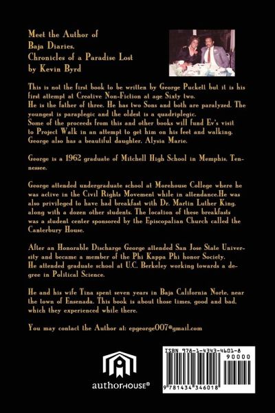 Foreword Kent Anderson, PhD For centuries, people have left their homes and familiar surroundings in search of "the other." This is a term long used by anthropologists to describe the urge in so many people to seek and experience "the exotic." Many humans seem willing to depart from a common culture, extended family and native tongue to enter a very different and unfamiliar setting. What you are about to read in BAJA DIARIES are the experiences of "the other" by George Puckett and his wife, Tina, a Black couple from Tucson, Arizona. In 1998, they embarked on a great adventure, leaving behind the United States of America, many friends and family, to settle in a beautiful enclave near the Pacific Ocean in the Mexican city of Ensenada in Baja California. The episodic nature of BAJA DIARIES reveals the high accomplishments of the Pucketts, their dashed hopes, and, ultimately, tragedy. The reader will learn about the many characters the Pucketts met during their stay, some saintly and some unsavory. A large portion of their experience details the religious infighting among the Americans they encountered in Ensenada. After several years in "paradise," George and Tina were overwhelmed by systematic Mexican skulduggery in the form of dubious real estate dealings (and double-dealings!) and the brutally pernicious behavior on the part of law enforcement. At the same time as their taste of "the other" was coming to a nasty climax, they were beset with a tragedy of unbelievable circumstance. I invite you to experience these strangely unsettling years of George and Tina Puckett.