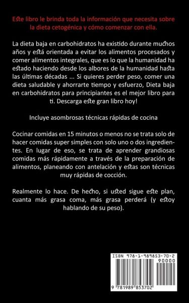 Este libro le brinda toda la información que necesita sobre la dieta cetogénica y cómo comenzar con ella. La dieta baja en carbohidratos ha existido durante muchos años y está orientada a evitar los alimentos procesados ¿¿y comer alimentos integrales, que es lo que la humanidad ha estado haciendo desde los albores de la humanidad hasta las últimas décadas ... Si quieres perder peso, comer una dieta saludable y ahorrarte tiempo y esfuerzo, Dieta baja en carbohidratos para principiantes es el mejor libro para ti. Descarga este gran libro hoy! Incluye asombrosas técnicas rápidas de cocina Cocinar comidas en 15 minutos o menos no se trata solo de hacer comidas super simples con solo uno o dos ingredientes. En lugar de eso, se trata de aprender grandiosas comidas más rápidamente a través de la preparación de alimentos, planeando con antelación y estas son técnicas muy rápidas de cocción. Realmente lo hace. De hecho, si usted sigue este plan, cuanta más grasa coma, más grasa perderá (y estoy hablando de su peso).