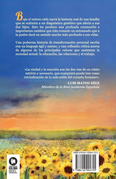 Bajo el mismo cielo narra, desde la mirada íntima y personal de uno de sus protagonistas, la historia real de una familia que se enfrenta a un diagnóstico genético que afecta a sus dos hijos. Esto produce una convulsión y profundos cambios en sus vidas que van creando el entramado que acaba dando sentido a sus vidas. Una historia poderosa de transformación personal que, con un lenguaje ágil y ameno, contiene, además, una necesaria reflexión crítica acerca de algunos de los principales valores que sustentan la sociedad actual: la educación, las relaciones y el trabajo. Diego decide mirar de frente a la adversidad y encuentra así el camino para replantearse su forma de vida, sus valores y sus prioridades y encontrar su propósito y el auténtico sentido de su existencia.
