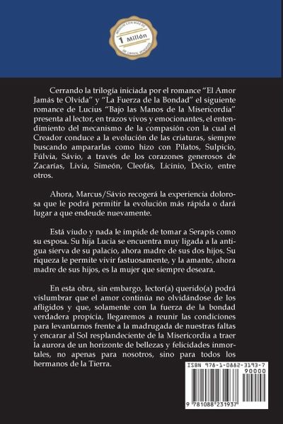 Bajo las Manos de la Misericordia Cerrando la trilogía iniciada por el romance "El Amor Jamás te Olvida" y "La Fuerza de la Bondad" el siguiente romance de Lucius "Bajo las Manos de la Misericordia" presenta al lector, en trazos vivos y emocionantes, el entendimiento del mecanismo de la compasión con la cual el Creador conduce a la evolución de las criaturas, siempre buscando ampararlas como hizo con Pilatos, Sulpicio, Fúlvia, Sávio, a través de los corazones generosos de Zacarías, Livia, Simeón, Cleofás, Licinio, Décio, entre otros. Ahora, Marcus/Sávio recogerá la experiencia dolorosa que le podrá permitir la evolución más rápida o dará lugar a que endeude nuevamente. Está viudo y nada le impide de tomar a Serapis como su esposa. Su hija Lucia se encuentra muy ligada a la antigua sierva de su palacio, ahora madre de sus dos hijos. Su riqueza le permite vivir fastuosamente, y la amante, ahora madre de sus hijos, es la mujer que siempre deseara. En esta obra, sin embargo, lector(a) querido(a) podrá vislumbrar que el amor continúa no olvidándose de los afligidos y que, solamente con la fuerza de la bondad verdadera propicia, llegaremos a reunir las condiciones para levantarnos frente a la madrugada de nuestras faltas y encarar al Sol resplandeciente de la Misericordia a traer la aurora de un horizonte de bellezas y felicidades inmortales, no apenas para nosotros, sino para todos los hermanos de la Tierra.
