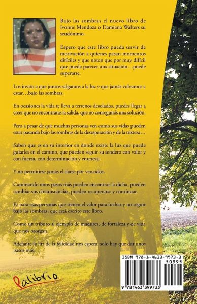 Bajo las sombras el nuevo libro de Ivonne Mendoza o Damiana Walters su seudónimo. Espero que este libro pueda servir de motivación a quienes pasan momentos difíciles y que noten que por muy difícil que pueda parecer una situación...puede superarse. Los invito a que juntos salgamos a la luz y que jamás volvamos a estar...bajo las sombras. En ocasiones la vida te lleva a terrenos desolados, puedes llegar a creer que no encontraras la salida, que no conseguirás una solución. Pero a pesar de que muchas personas ven como sus vidas pueden estar pasando bajo las sombras de la desesperación y de la tristeza... Saben que es en su interior en donde existe la luz que puede guiarles en el camino, que pueden seguir su sendero con valor y con fuerza, con determinación y entereza. Y no permitirse jamás el darse por vencidos. Caminando unos pasos más pueden encontrar la dicha, pueden cambiar sus circunstancias, pueden recuperarse y continuar. Es para esas personas que tienen el valor para luchar y no seguir bajo las sombras, que está escrito este libro. Como un tributo al ejemplo de madurez, de fortaleza y de vida que nos otorgan. Adelante la luz de la felicidad nos espera, solo hay que dar unos pasos más.
