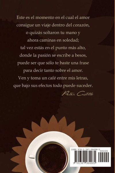 Libro de frases y poesía, amor, desamor. Este es el momento en el cual el amor consigue un viaje dentro del corazón, o quizás soltaron tu mano y ahora caminas en soledad; tal vez estás en el punto más alto, donde la pasión se escribe a besos, puede ser que sólo te baste una frase para decir tanto sobre el amor. Ven y toma un café entre mis letras, que bajo sus efectos todo puede suceder.