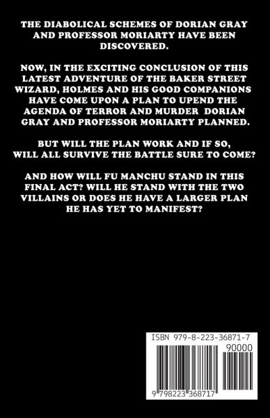 THE DIABOLICAL SCHEMES OF DORIAN GRAY AND PROFESSOR MORIARTY HAVE BEEN DISCOVERED! NOW, IN THE EXCITING CONCLUSION OF THIS LATEST ADVENTURE OF THE BAKER STREET WIZARD, HOLMES AND HIS GOOD COMPANIONS HAVE COME UPON A PLAN TO UPEND THE AGENDA OF TERROR AND MURDER DORIAN GRAY AND PROFESSOR MORIARTY PLANNED. BUT WILL THE PLAN WORK AND IF SO, WILL ALL SURVIVE THE BATTLE SURE TO COME? AND HOW WILL FU MANCHU STAND IN THIS FINAL ACT? WILL HE STAND WITH THE TWO VILLAINS OR DOES HE HAVE A LARGER PLAN HE HAS YET TO MANIFEST? JUMP INTO THE LAST BOOK AND ENJOY.