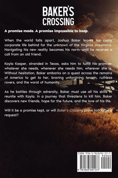 A promise made. A promise impossible to keep. When the world falls apart, Joshua Baker leaves his cushy corporate life behind for the unknown of the Virginia mountains. Navigating his new reality becomes his norm-until he receives a call from an old friend. Kayla Kasper, stranded in Texas, asks him to fulfill his promise: whatever she needs, whenever she needs him, wherever she is. Without hesitation, Baker embarks on a quest across the remains of America to get to her, braving unforgiving terrain, ruthless rovers, and the worst of humanity. As he battles through adversity, Baker must use all his skills to reunite with Kayla. In a journey that threatens to kill him, Baker discovers new friends, hope for the future, and the love of his life. Will it be a promise kept, or will Baker's Crossing prove too large a request?