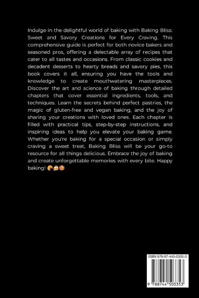 Indulge in the delightful world of baking with Baking Bliss: Sweet and Savory Creations for Every Craving. This comprehensive guide is perfect for both novice bakers and seasoned pros, offering a delectable array of recipes that cater to all tastes and occasions. From classic cookies and decadent desserts to hearty breads and savory pies, this book covers it all, ensuring you have the tools and knowledge to create mouthwatering masterpieces. Discover the art and science of baking through detailed chapters that cover essential ingredients, tools, and techniques. Learn the secrets behind perfect pastries, the magic of gluten-free and vegan baking, and the joy of sharing your creations with loved ones. Each chapter is filled with practical tips, step-by-step instructions, and inspiring ideas to help you elevate your baking game. Whether you're baking for a special occasion or simply craving a sweet treat, Baking Bliss will be your go-to resource for all things delicious. Embrace the joy of baking and create unforgettable memories with every bite. Happy baking! ������������