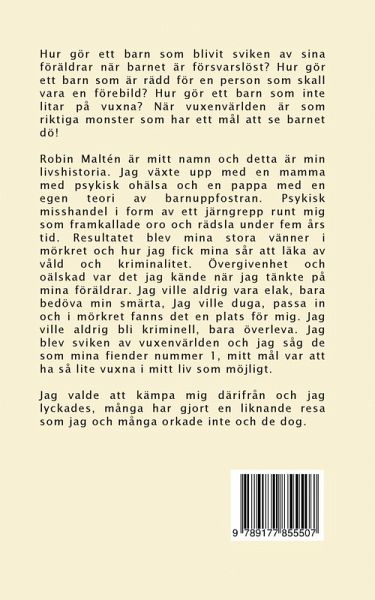 Hur gör ett barn som blivit sviken av sina föräldrar när barnet är försvarslöst? Hur gör ett barn som är rädd för en person som skall vara en förebild? Hur gör ett barn som inte litar på vuxna? När vuxenvärlden är som riktiga monster som har ett mål att se barnet dö! Robin Maltén är mitt namn och detta är min livshistoria. Jag växte upp med en mamma med psykisk ohälsa och en pappa med en egen teori av barnuppfostran. Psykisk misshandel i form av ett järngrepp runt mig som framkallade oro och rädsla under fem års tid. Resultatet blev mina stora vänner i mörkret och hur jag fick mina sår att läka av våld och kriminalitet. Övergivenhet och oälskad var det jag kände när jag tänkte på mina föräldrar. Jag ville aldrig vara elak, bara bedöva min smärta, Jag ville duga, passa in och i mörkret fanns det en plats för mig. Jag ville aldrig bli kriminell, bara överleva. Jag blev sviken av vuxenvärlden och jag såg de som mina fiender nummer 1, mitt mål var att ha så lite vuxna i mitt liv som möjligt. Jag valde att kämpa mig därifrån och jag lyckades, många har gjort en liknande resa som jag och många orkade inte och de dog.