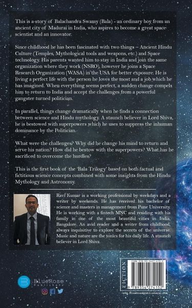 This is a story of Balachandra Swamy (Bala) - an ordinary boy from an ancient city of Madurai in India, who aspires to become a great space scientist and an innovator. Since childhood he has been fascinated with two things - Ancient Hindu Culture (temples, mythological tools and weapons, etc.) and Space technology. His parents wanted him to stay in India and join the same organization where they work (NSRO - National Space Research Organization), however he decides to join the world-famous Space Research Organization in the USA (WASA - World Aeronautics Space Agency) for better exposure. He is living a perfect life with the person he loves the most and a job which he has dreamt. When everything seems perfect, a sudden change compels him to come back to India and accept challenges from a powerful gangster turned politician. In parallel, things change dramatically when he finds a connection between science and Hindu mythology. A staunch believer in Lord Shiva, he is bestowed with superpowers which he uses to suppress the inhuman dominance by the Politician. What was the challenge? Why did he change his mind to be back home and serve his nation? How did he bestow with the superpowers? what are those superpowers? What has he sacrificed to overcome the hurdles? This is the first book from the 'Bala' Trilogy which is based on both factual and fictitious science concepts combined with some beliefs from Hindu mythology and Cosmology to give you the best experience of a lifetime. Behold, imagine and feel the new real world in which virtuous fights with evil with all the powers from the universe.