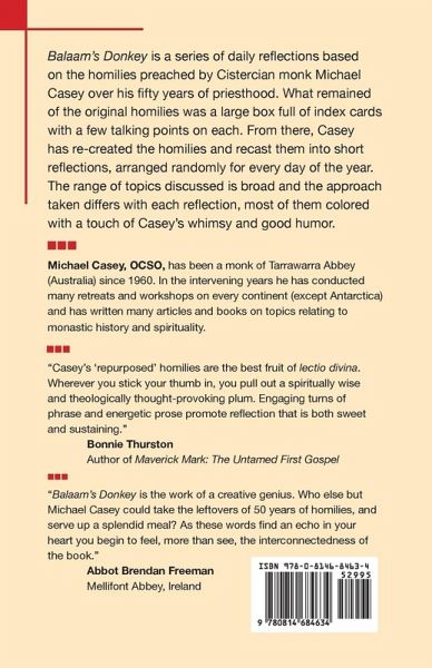 Balaam's Donkey is a series of daily reflections based on the homilies preached by Cistercian monk Michael Casey over his fifty years of priesthood. What remained of the original homilies was a large box full of index cards with a few talking points on each. From there, Casey has re-created the homilies and recast them into short reflections, arranged randomly for every day of the year. The range of topics discussed is broad and the approach taken differs with each reflection, most of them colored with a touch of Casey's whimsy and good humor.