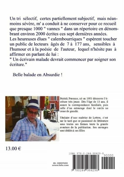 Un tri sélectif, certes partiellement subjectif, mais néanmoins sévère, m'a conduit à ne conserver pour ce recueil que presque 1000 "vannes" dans un répertoire en dénombrant environ 2000 écrites ces sept dernières années. Les heureuses élues "calembourriques" espèrent toucher un public de lecteurs âgés de 7 à 177 ans, sensibles à l'humour et à la poésie de l'auteur, lequel n'hésite pas à affirmer en parlant de lui : " Un écrivain malade devrait commencer par soigner son écriture." Belle balade en Absurdie !