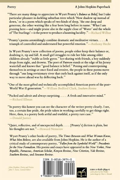 In Wyatt Prunty's new collection of poems, people either keep their balance or, doubting it, tip and fall. A small girl struggles to ride her bike among older children already 'stable as little gyros.' Ice-skating with friends, a boy suddenly drops from sight, and drowns. The poet of Paterson stands at the edge of his Jersey waterfall and knows that 'good balance is belief.' Poising and counterpoising themselves in settings at once fixed and erosive, the people in these poems move through 'one long revisionary river that curls back against itself, as if the only way to move ahead was by deflecting back.'