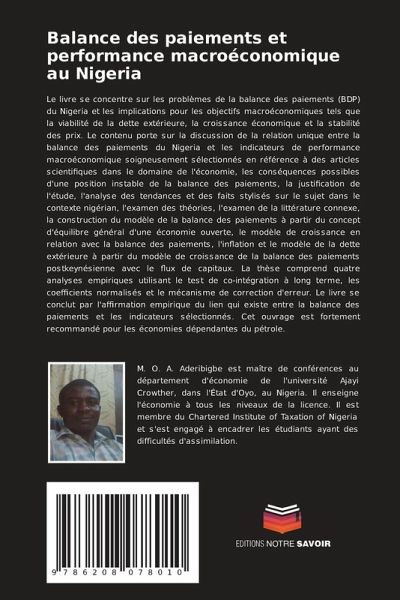 Le livre se concentre sur les problèmes de la balance des paiements (BDP) du Nigeria et les implications pour les objectifs macroéconomiques tels que la viabilité de la dette extérieure, la croissance économique et la stabilité des prix. Le contenu porte sur la discussion de la relation unique entre la balance des paiements du Nigeria et les indicateurs de performance macroéconomique soigneusement sélectionnés en référence à des articles scientifiques dans le domaine de l'économie, les conséquences possibles d'une position instable de la balance des paiements, la justification de l'étude, l'analyse des tendances et des faits stylisés sur le sujet dans le contexte nigérian, l'examen des théories, l'examen de la littérature connexe, la construction du modèle de la balance des paiements à partir du concept d'équilibre général d'une économie ouverte, le modèle de croissance en relation avec la balance des paiements, l'inflation et le modèle de la dette extérieure à partir du modèle de croissance de la balance des paiements postkeynésienne avec le flux de capitaux. La thèse comprend quatre analyses empiriques utilisant le test de co-intégration à long terme, les coefficients normalisés et le mécanisme de correction d'erreur. Le livre se conclut par l'affirmation empirique du lien qui existe entre la balance des paiements et les indicateurs sélectionnés. Cet ouvrage est fortement recommandé pour les économies dépendantes du pétrole.