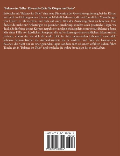 "Balance im Teller: Die sanfte Diät für Körper und Seele" Erforsche mit "Balance im Teller" eine neue Dimension der Gewichtsregulierung, bei der Körper und Seele im Einklang stehen. Dieses Buch lädt dich dazu ein, die herkömmlichen Vorstellungen von Diäten zu überdenken und dich auf einen Weg der Ausgewogenheit zu begeben. Hier findest du nicht nur Anleitungen zu gesunder Ernährung, sondern auch praktische Tipps, wie du die Bedürfnisse deines Körpers respektierst und gleichzeitig deine emotionale Balance pflegst. Mit einer Fülle von köstlichen Rezepten, die auf ernährungswissenschaftlichen Erkenntnissen basieren, erlebst du, wie sich die sanfte Diät in einen genussvollen Lebensstil verwandelt. Schenke deinem Körper die Aufmerksamkeit, die er verdient, und finde die harmonische Balance, die nicht nur zu einer gesunden Figur, sondern auch zu einem erfüllten Leben führt. Tauche ein in "Balance im Teller" und entdecke die wahre Freude am Essen und Leben.