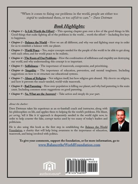 "When it comes to fixing our problems in the world, people are either too stupid to understand them, or too selfish too care." - Dave Dettman Book Highlights: · Chapter 1 - Is Life Worth the Effort? - This opening chapter goes over a few of the good things in life. Good things that make fighting all of the problems in the world. worth the effort! - Including five keys to happiness. . · Chapter 2 - Balance the World - How we are all different, and why war and fighting must stop in order for us to establish a balance with our planet. · Chapter 3 - World Peace - Ten, major concepts needed for the people of the world to be able to get along with each other, and for world peace to be realistic. · Chapter 4 - The Roots of Our Problems - How the combination of selfishness and stupidity are destroying our world, and why understanding this concept is so important. · Chapter 5 - Selfishness - The importance of teamwork, compromise, and prioritizing. · Chapter 6 - Stupidity - The importance of education, prevention, and mental toughness. Including suggestions on how to re-structure our educational systems. · Chapter 7 - Abuse of Religion - Not religion itself, but how religion gets abused. My theories on religion, and how it prevents the much-needed, world-wide teamwork. · Chapter 8 - Bad Parenting - How over-population is killing our planet, and why bad parenting is the main cause. Including common sense suggestions on good parenting. · Chapter 9 - So, What are the Answers? - Take action and simply do your part.