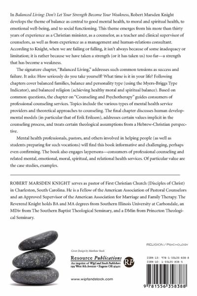 In Balanced Living: Don't Let Your Strength Become Your Weakness, Robert Knight develops the theme of balance as central to good mental health, to moral and spiritual health, to emotional well-being, and to social functioning. This theme emerges from his more than thirty years of experience as a Christian minister, as a counselor, as a teacher and clinical supervisor of counselors, as well as from experience as a management and human-relations consultant. According to Knight, when we are failing or falling, it isn't always because of some inadequacy or limitation; it is rather because we have taken a strength (or it has taken us) too far--a strength that has become a weakness. The signature chapter, ""Balanced Living,"" addresses such common tensions as success and failure. It asks: How seriously do you take yourself? What time is it in your life? Following chapters cover balanced families, balance and personality type (using the Myers-Briggs Type Indicator), and balanced religion (achieving healthy moral and spiritual balance). Based on common questions, the chapter on ""Counseling and Psychotherapy"" guides consumers of professional counseling services. Topics include the various types of mental health service providers and theoretical approaches to counseling. The final chapter discusses human developmental models (in particular that of Erik Erikson), addresses certain values implicit in the counseling process, and treats certain theological assumptions from a Hebrew-Christian perspective. Mental health professionals, pastors, and others involved in helping people (as well as students preparing for such vocations) will find this book informative and challenging, perhaps even confirming. The book also engages laypersons--consumers of professional counseling and related mental, emotional, moral, spiritual, and relational health services. Of particular value are the case studies, examples, and illustrations presented in Balanced Living: Don't Let Your Strength Become Your Weakness.