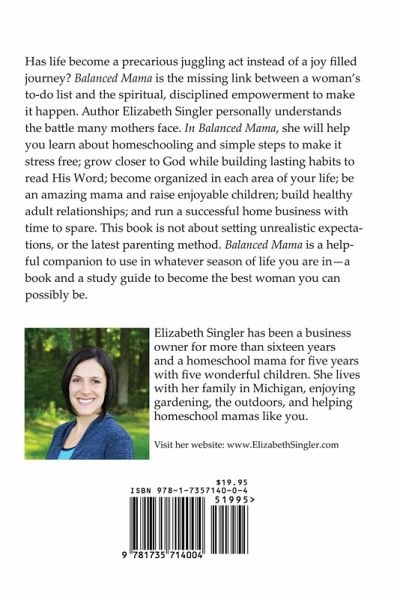 Has life become a precarious juggling act instead of a joy filled journey? Balanced Mama is the missing link between a woman's to-do list and the spiritual, disciplined empowerment to make it happen. Author Elizabeth Singler, personally understands the 'Juggling' battle which many mothers face. In Balanced Mama, she will help you: Learn about homeschooling and simple steps to make it stress free. Grow closer to God while building lasting habits to read His Word. Become organized in each area of your life. Be an amazing mama and raise enjoyable children. Build healthy adult relationships. Run a successful home business with time to spare. This book is not about setting unrealistic expectations, or the latest parenting method. Balanced Mama is a helpful companion to use in whatever season of life you are in - a book and a study guide to become the best woman you can possibly be.